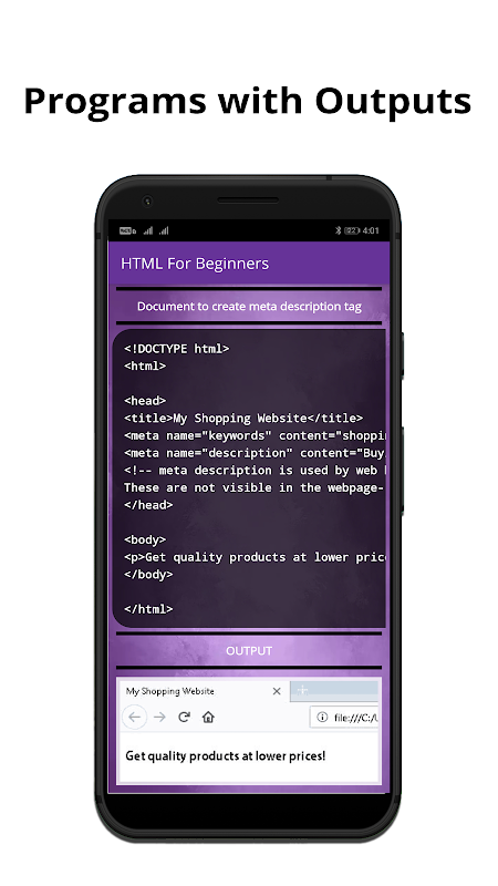 HTML را که امروزه بیشترین تقاضای تلفن همراه شما است به صورت رایگان بیاموزید. برای یادگیری HTML هیچ تجربه قبلی در برنامه نویسی یا توسعه لازم نیست. با برنامه ما قادر خواهید بود که تقریباً در هیچ زمان و در هیچ زمان کد HTML را رمزگذاری نکنید. بیشتر کدهای HTML ما برای درک بهتر کاربر ، با توضیحات HTML توضیح داده شده اند.