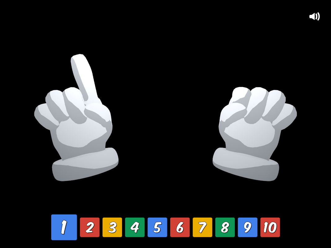 I Can Count To Ten uses changing sounds, color, and animation to attract and maintain attention and encourages the child to mimic what they see on the mobile device screen. The user interface consists of a screen with a black background, and a set of 3-D animated hands in the foreground that look similar to the cartoon hards of Mickey Mouse. A repeating animation shows the progression of retracted and extended fingers from 1 to 10, and a voice speaks each number aloud as each finger extends or retracts. If the child interacts with the mobile device screen by tapping or swiping, the animation will react accordingly, moving back, and forward to the correct number.