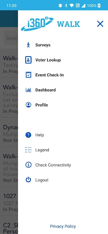 انقلابی درب به درب canvassing با برنامه پیاده روی i360. ایده آل برای سیاسی، مردمی و سازمان های حمایتی، در حال حاضر شما می توانید نظرسنجی سفارشی به هر مخاطبان هدف و محل در سراسر کشور ساخت، و پاسخ بازگشت به پایگاه داده در زمان واقعی است. این برنامه توسط گسترده پایگاه داده رای دهندگان i360 بر اساس مشتری های مشتری را از طریق i360 امکان پذیر شده است، در دسترس است. برای نام کاربری و رمز عبور خود، لطفا مدیر حساب خود تماس بگیرید. و یا به راه اندازی یک حساب کاربری جدید، لطفا i360 تماس بگیرید در [email protected]