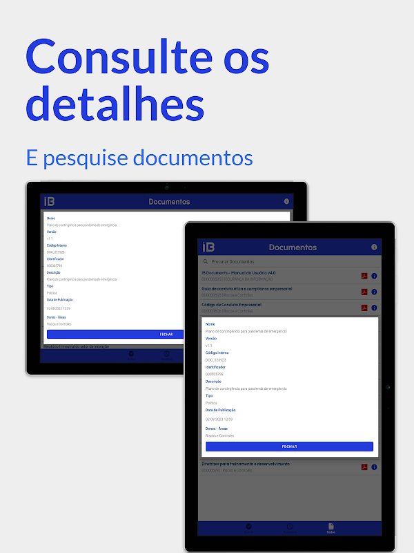 IB DOCs برنامهای است که به کاربر اجازه میدهد تا اسنادی را که در IB به آنها دسترسی دارد در هر دستگاه تلفن همراه اندرویدی حتی در حالت آفلاین مشاهده کند. این برنامه به طور مستقیم با اسناد IB ادغام می شود و به کاربر اجازه می دهد اسنادی را که به آنها دسترسی دارد دانلود کند. این اسناد حتی زمانی که کاربر به اینترنت یا وای فای دسترسی ندارد برای مشاوره در دسترس است. برای استفاده از برنامه، کاربر باید با همان اعتبار دسترسی هایی که در IB استفاده می کند، احراز هویت کند. زمانی که IB DOC تشخیص می دهد کاربر آنلاین است، همگام سازی سند به طور خودکار انجام می شود. کاربر فقط به آخرین نسخه منتشر شده به هر سند دسترسی خواهد داشت و در هنگام همگام سازی سیستم به صورت هوشمند نسخه قبلی را حذف و در صورت وجود نسخه جدید جایگزین می کند.