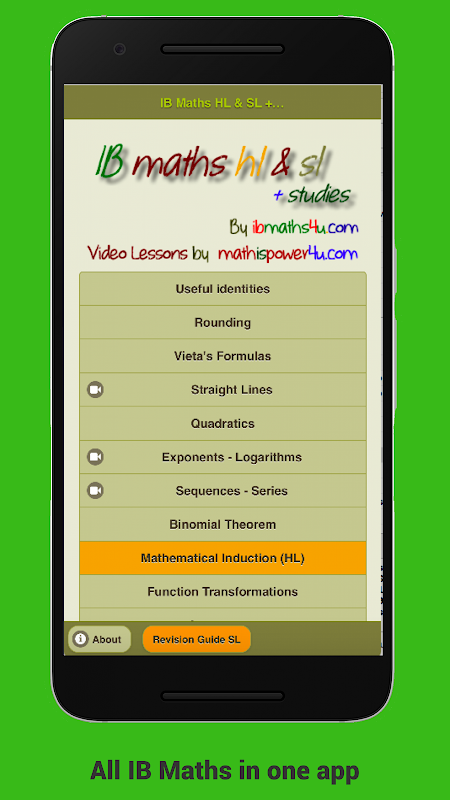 این روزانه توسط هزاران دانش آموز مورد استفاده قرار می گیرد و تقریباً همه چیز را برای موفقیت در امتحانات ریاضی IB خود ارائه می دهد. این معلم ریاضی شخصی شما است. این برنامه قصد دارد به دانشجویان کمک کند تا موضوعات اصلی ریاضی برنامه های درسی خود را بازنگری و درک کنند.