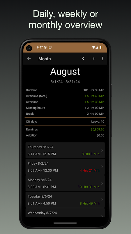 - محاسبه خودکار استراحت، ساعات کار، اضافه کاری، زمان هدف و درآمد