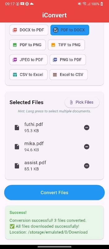 به iConvert خوش آمدید، برنامه کاربردی شما برای تبدیل فایل بدون درز در حال حرکت! iConvert که توسط Cebo Mkhwanazi توسعه داده شده است، به شما این امکان را می دهد که بدون زحمت طیف گسترده ای از فرمت های فایل، از جمله DOCX را به PDF، PDF به PNG، JPEG به PDF، CSV به Excel و غیره را از دستگاه Android خود تبدیل کنید.