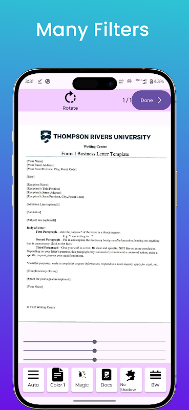 برش خودکار و بهبود کیفیت: تشخیص لبه هوشمند اسکن کامل را تضمین می کند. بهبود خودکار وضوح متن واضح و کیفیت تصویر پر جنب و جوش را در PDF های شما بهبود می بخشد.