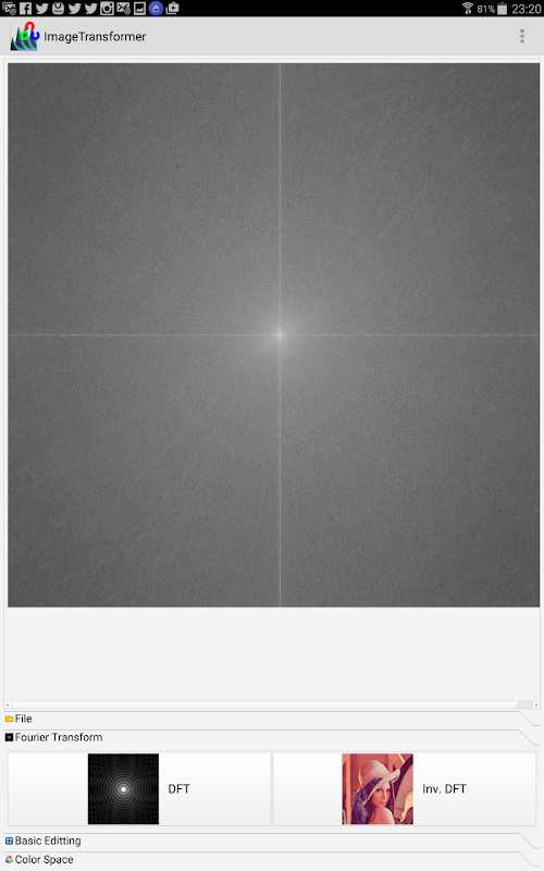 This program allows you to perform Fourier transform and color space analysis on images from gallery and taken from camera.