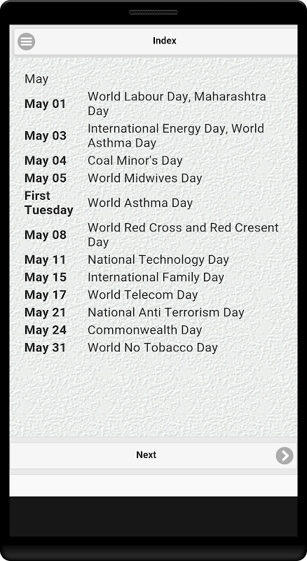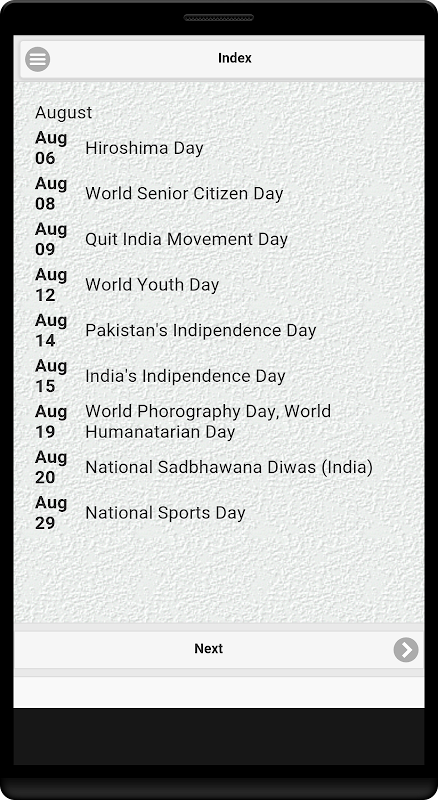 All important days and dates on your fingertips. The app is in the context of India.