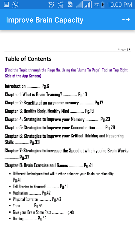 بهبود ظرفیت مغز یک تمایل قوی برای همه بوده است، اما پیدا کردن excerises راست و با نگه داشتن آنها را کاملا یک چالش است. بهبود ظرفیت مغز برنامه طراحی شده است به کمک طلب کردن تمام نیازهای یک مغز سالم و عقل سلیم.