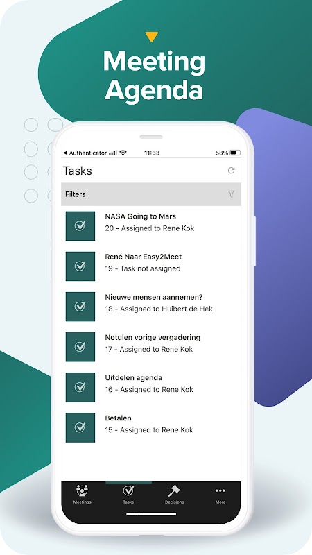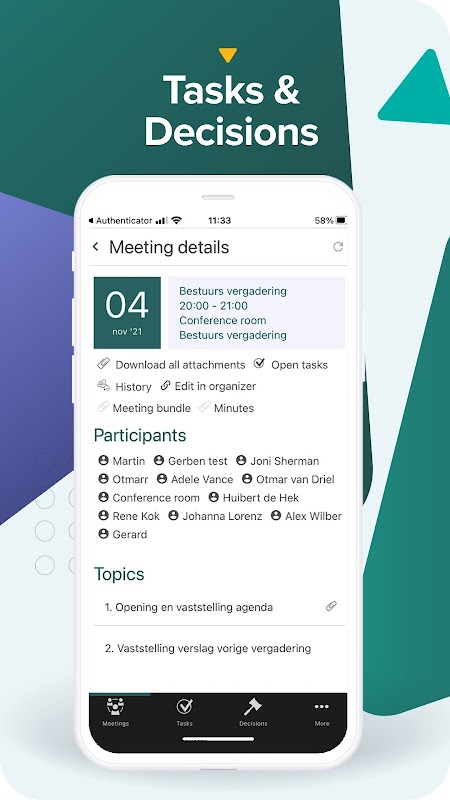 این برنامه شرکت کننده برای راه حل جلسه Indeqa است. Indeqa مخفف: Simple and Effective; کاملا دیجیتال پشتیبانی بهینه برای منشی ها و شرکت کنندگان در جلسه. که در آن دستور کار شخصی پیشرو است و موضوعات / پیوست ها همیشه به روز هستند. و برای هر کسی که در هر جلسه ای در هر مکانی شرکت می کند، راه های آسانی برای حاشیه نویسی اسناد و به اشتراک گذاری آن ها با یکدیگر ارائه می دهد. این برنامه را در حالت نمایشی امتحان کنید تا بفهمید چگونه می تواند بهره وری شما را افزایش دهد. آیا سازمان شما در حال حاضر از Indeqa استفاده می کند؟ برای مشاهده اطلاعات جلسه خود وارد شوید.