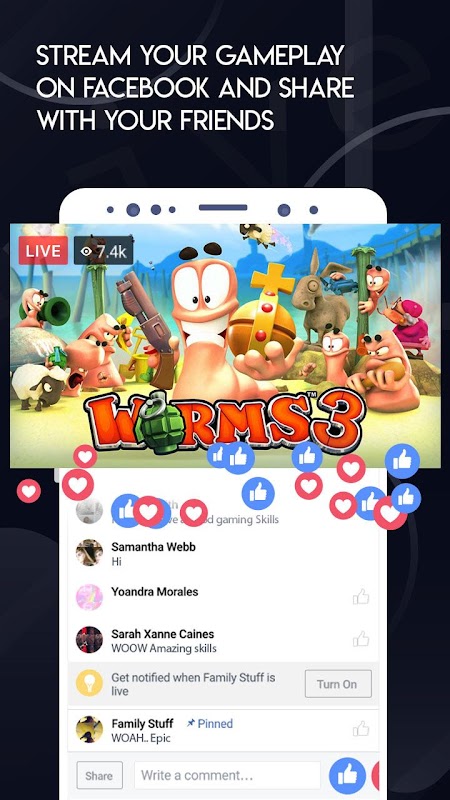 You can link your facebook account and live stream your games and other apps on facebook public or private.
