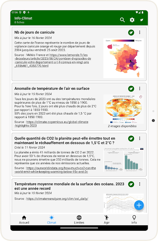 این برنامه به شما امکان می دهد تمام برگه های اطلاعات مربوط به گرمایش جهانی و مرزهای سیاره ای را که در حال حاضر منتشر شده است مشاهده کنید.
