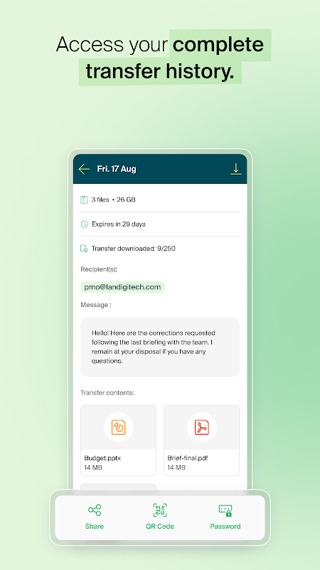 - نقل و انتقالات خود را سفارشی کنید: پیامی اضافه کنید، تاریخ انقضا تعیین کنید، دانلودها را محدود کنید و از فایل های خود با رمز عبور محافظت کنید