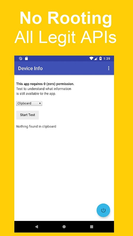 این برنامه با استفاده از تمام API های موجود ، میانبرها و روش های راه حل ، اما بدون استفاده از مجوز Android ، اطلاعاتی در مورد دستگاه Android your شما ارائه می دهد. این ابزاری است که به کاربران یا توسعه دهندگان اجازه می دهد خطرات سرقت اطلاعات و حریم خصوصی اطلاعات را که حتی در یک برنامه بدون هیچ گونه اجازه ای وجود دارد ، درک کنند.