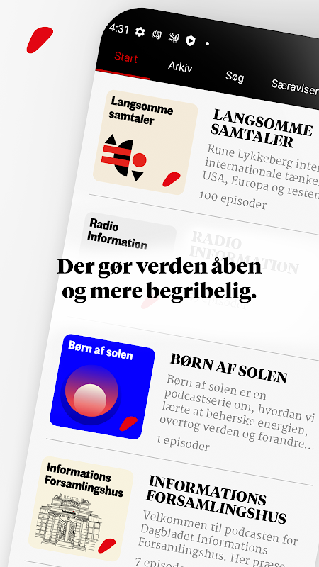 همچنین میتوانید هر روز به مقالاتی که با صدای بلند در برنامه خوانده میشوند، که توسط نویسندگان و راویان حرفهای ما صحبت میشود، گوش دهید، همانطور که میتوانید از اطلاعاتی که بیشتر دوست دارید، به عنوان مثال نسخه هفتگی «اطلاعات رادیویی» به پادکستها دسترسی پیدا کنید. سودوکوس روزانه و پازل های دیگر را نیز می توان به طور مستقیم در برنامه حل کرد.