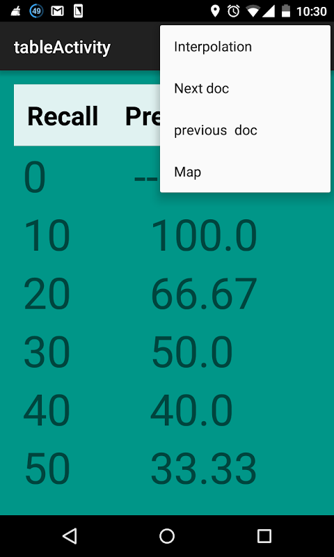 this app show the Recall and precision detail of ir evaluation and show the chart of recall vs precision and histogram chart , and E-Measure and F-Measure , also there is IR Modeling