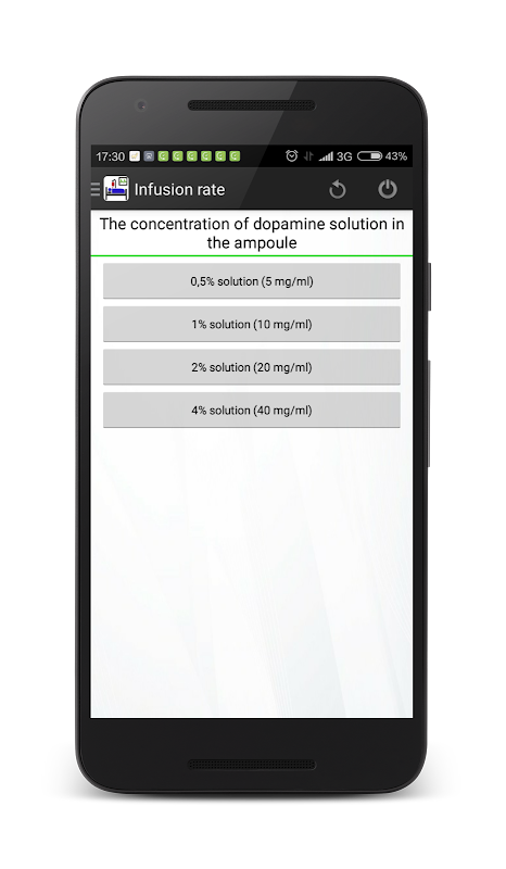 این برنامه اجازه می دهد تا برای محاسبه نرخ تزریق مواد مخدر. شما نیاز به انتخاب وزن بیمار، رقت از راه حل. انتقال از ساعت میلی لیتر / به میلی گرم / دقیقه، دوز mg / kg (پوند) / دقیقه، دوز mg / kg (پوند) / ساعت، با دوز mg / ساعت، میکروگرم / دقیقه، میکروگرم / کیلوگرم (پوند) / دقیقه، میکروگرم / کیلوگرم (پوند ) / ساعت، میکروگرم / ساعت سریع، ساده و به حداقل تعداد کلیک است. در تنظیمات شما می توانید کیلوگرم یا پوند را انتخاب نمایید.