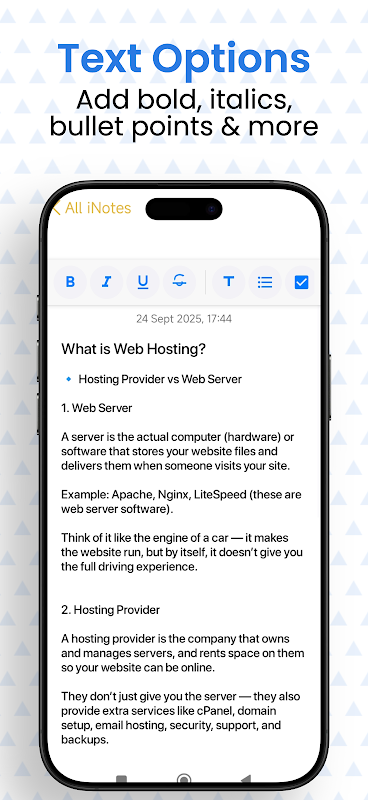 Your notes are saved only on your device. iNote is not affiliated with Apple — it simply gives you the familiar iOS notes feel on Android. No third-party access, no cloud sync by default.