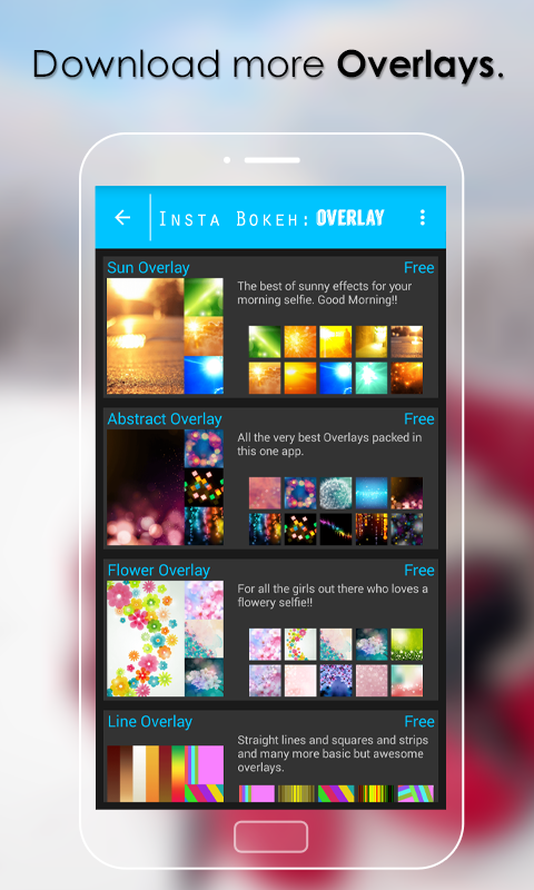 InstaBokeh helps you add awesome bokeh light effects to your photo with just few taps! Simply select Overlay Effects and tap your photo, then you will get a beautiful photo.