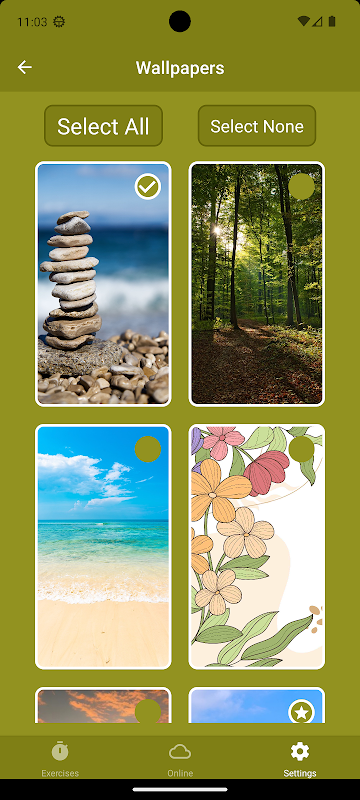 هر تمرین یک تایمر است که شامل چهار مرحله است: دم (نفس به داخل)، نگه داشتن، بازدم (نفس خارج کردن)، و منتظر چرخه بعدی. تمرینات زیر گنجانده شده است: