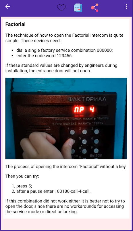 با اپلیکیشن «کدهای اینترکام»، کاربران به راحتی می توانند کد مورد نیاز برای باز کردن اینترکام را پیدا کنند. این برنامه تمام کدهای مربوط به دستگاه های مخابره داخل ساختمان را ارائه می دهد که می توان از آنها برای دسترسی به ساختمان استفاده کرد.