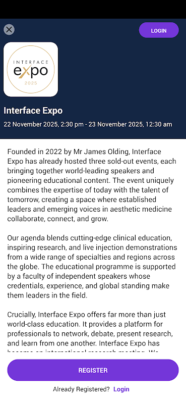 اینترفیس اکسپو که در سال 2022 توسط آقای جیمز اولدینگ تأسیس شد، قبلاً میزبان سه رویداد فروخته شده بوده است که هر کدام سخنرانان برجسته جهان و محتوای آموزشی پیشگام را گرد هم می آورد. این رویداد به طور منحصربهفردی تخصص امروز را با استعداد فردا ترکیب میکند و فضایی را ایجاد میکند که در آن رهبران تثبیت شده و صداهای نوظهور در پزشکی زیبایی با یکدیگر همکاری میکنند، به هم متصل میشوند و رشد میکنند.