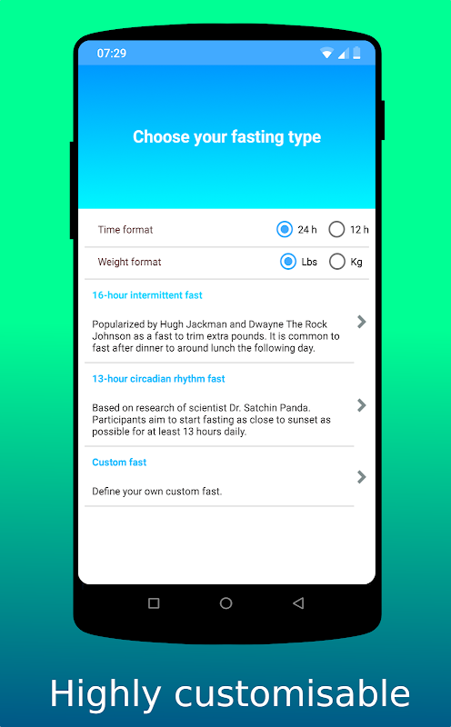 Fasti به کاربران این امکان را می دهد تا 3 نوع روزه ، 16 ساعت سریع ، 13 ساعت سریع یا یک روزه داری سفارشی ایجاد کنند. حتی امکان تنظیم روزه های طولانی تر (حداکثر 72 ساعت) را دارد.