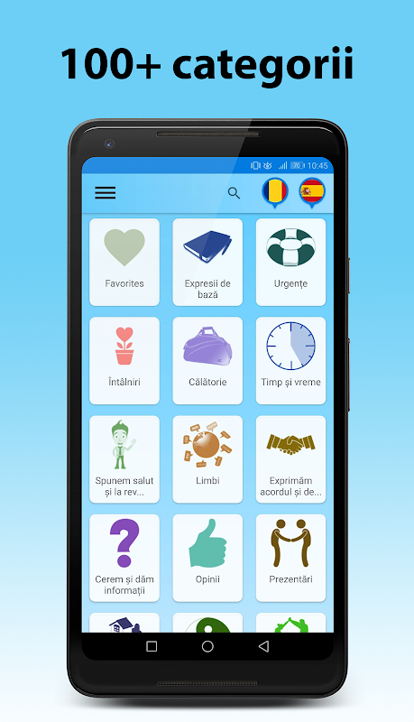 Invata Spaniola conține peste 10000 de cuvinte și expresii spaniole utilizate frecvent pentru călători și începători în 15 categorii și peste 100 de subcategorii.