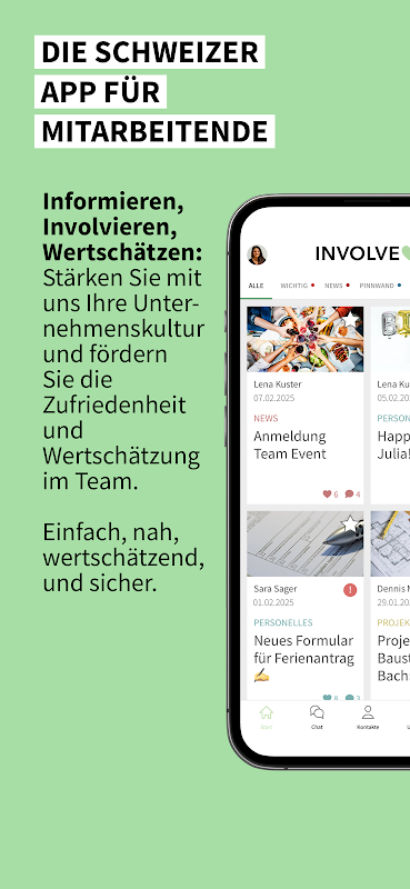 اطلاع رسانی، مشارکت و قدردانی از کارمندان - این همان چیزی است که برنامه کارمند Involve مخفف آن است. با کانال های ارتباطی کوتاه، عملکرد ساده و طراحی جذاب، برنامه سوئیسی برای کارمندان حداکثر کاربرپسندی را ارائه می دهد و بنابراین راه حل عالی شما برای ارتباطات داخلی است. برنامه کارمند Involve 100٪ در سوئیس توسعه یافته است و به طور مداوم در حال توسعه بیشتر در سوئیس است. داده ها به صورت ایمن و اضافی در سرورهای سوئیس میزبانی می شوند.