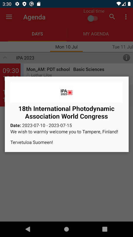 به IPA-2023 - هجدهمین کنگره جهانی انجمن بین المللی فتودینامیک دوسالانه خوش آمدید. با این اپلیکیشن می توانید برنامه و جلسات این کنگره را به راحتی پیگیری کنید و برنامه خود را تنظیم کنید. IPA-2023 با هدف گرد هم آوردن محققان و پزشکان در همه زمینههای فتودینامیک تراپی (PDT) و تشخیص عکس (PDD) IPA-2023 شما را به شادترین کشور جهان، فنلاند، و جذابترین شهر آن، تامپره دعوت میکند. حامی ما Modulight به گرمی از همه محققان و پزشکان در تامپره استقبال می کند!