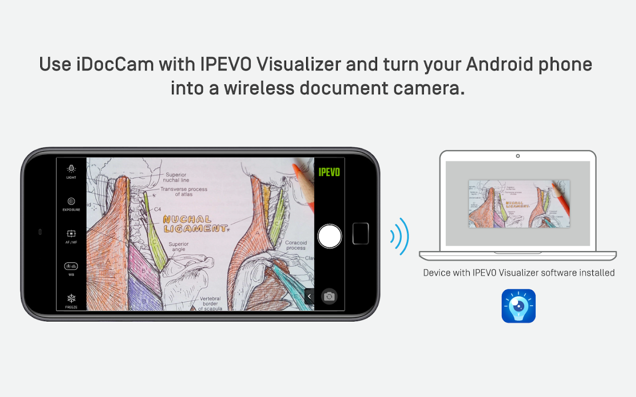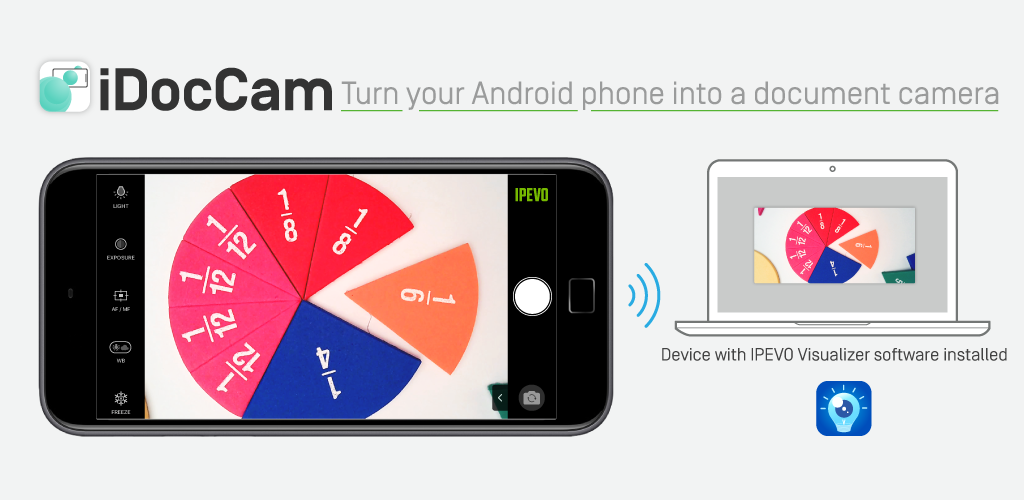 iDocCam را بر روی تلفن خود نصب کنید. در مرحله بعد ، نرم افزار IPEVO Visualizer را روی دستگاه دیگری (دستگاه های Mac / PC / Chromebook / iOS و Android) نصب کنید.