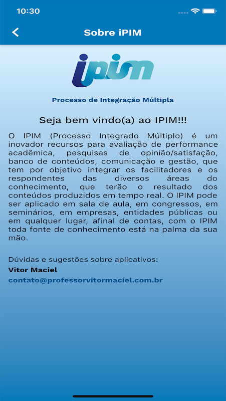 O IPIM (Processo Integrado Múltiplo) é um inovador recursos para avaliação de performance acadêmica, pesquisas de opinião/satisfação, banco de conteúdos, comunicação e gestão, que tem por objetivo integrar os facilitadores e os respondentes das diversos áreas do conhecimento, que terão o resultado dos conteúdos produzidos em tempo real. O IPIM pode ser aplicado em sala de aula, em congressos, em seminários, em empresas, entidades públicas ou em qualquer lugar, afinal de contas, com o IPIM toda fonte de conhecimento está na palma da sua mão.