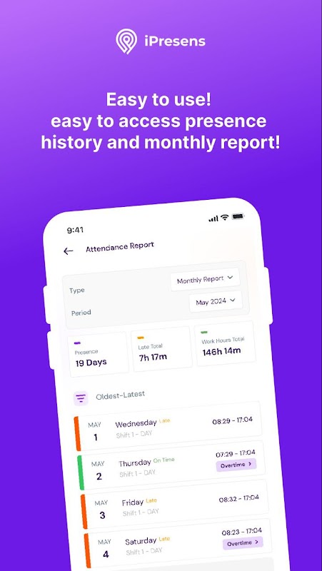 با ردیابی حضور و غیاب دست و پا گیر خداحافظی کنید و به iPresens سلام کنید! برنامه موبایل پیشرفته ما برای ساده کردن مدیریت حضور و غیاب طراحی شده است و آن را برای کارگران سیار، کارمندان از راه دور و دفاتر چند شعبه بی دردسر و کارآمد می کند. ویژگی های قوی ای را که iPresens را به راه حل نهایی حضور و غیاب برای مشاغل مدرن تبدیل می کند، کاوش کنید.
