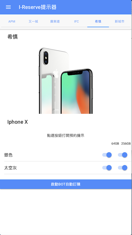 免費為用戶提供 iReserve 開賣資訊,用戶可跟據需要自訂指定分店指定型號 iPhone 開賣通知,並且提供 bot 功能,可以更快搶購 iPhoneX。