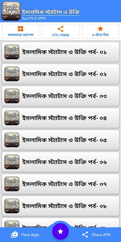 ইসলামিক স্ট্যাটাস দিতে আগ্রহী যারা তাদের জন্য ইসলামিক পোস্ট বা ইসলামিক উক্তি অথবা ইসলামিক বাংলা এসএমএস নিয়ে হাজির হলাম এই اسلامی برنامه وضعیت টি তে. ইসলামিক বাংলা স্ট্যাটাস এবং রাসুলুল্লাহ (সাঃ) এর উপদেশমালা একসাথে রয়েছে তাই এককথায় এপ টিকে بهترین برنامه وضعیت اسلامی বলতে পারেন. বিভিন্ন সাহাবীদের জীবনে যে উক্তি গুলো বলে গেছেন তার থেকে বাছাইকৃত শ্রেষ্ঠ উক্তি গুলো নিয়ে وضعیت اسلامی بنگلادش برنامه টি তৈরি করা হয়েছে.
