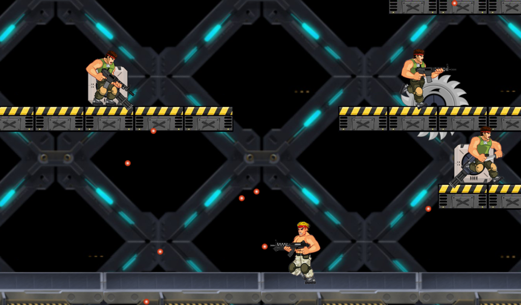 The controls consists of an eight-way joystick or directional pad and two action buttons for shooting (left) and jumping (right). But currently shooting is automatic. The joystick controls not only the player's movement while walking and jumping, but also his aiming.