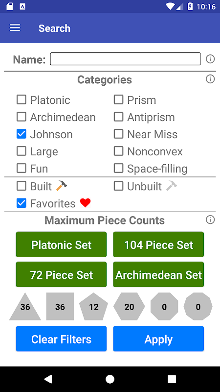 مدل ارائه شده اشیاء با چهره که چند ضلعی منظم با 3، 4، 5، 6، 8 و 10 طرف هستند. این خدمات عبارتند از: جامد افلاطونی، مواد جامد ارشمیدسی، مواد جامد جانسون، منشور، antiprisms، مواد جامد غیر محدب، و اشیاء است که به طور کامل بسته نشده است.