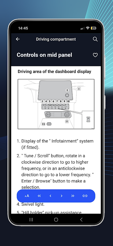 علاوه بر ناوبری کلاسیک، دارای ناوبری جدید و بصری است: نقاط داغ روی تصویر خودرو یا اجزای منفرد را می توان برای نمایش بخش مربوطه از کتابچه راهنمای کاربر استفاده کرد.