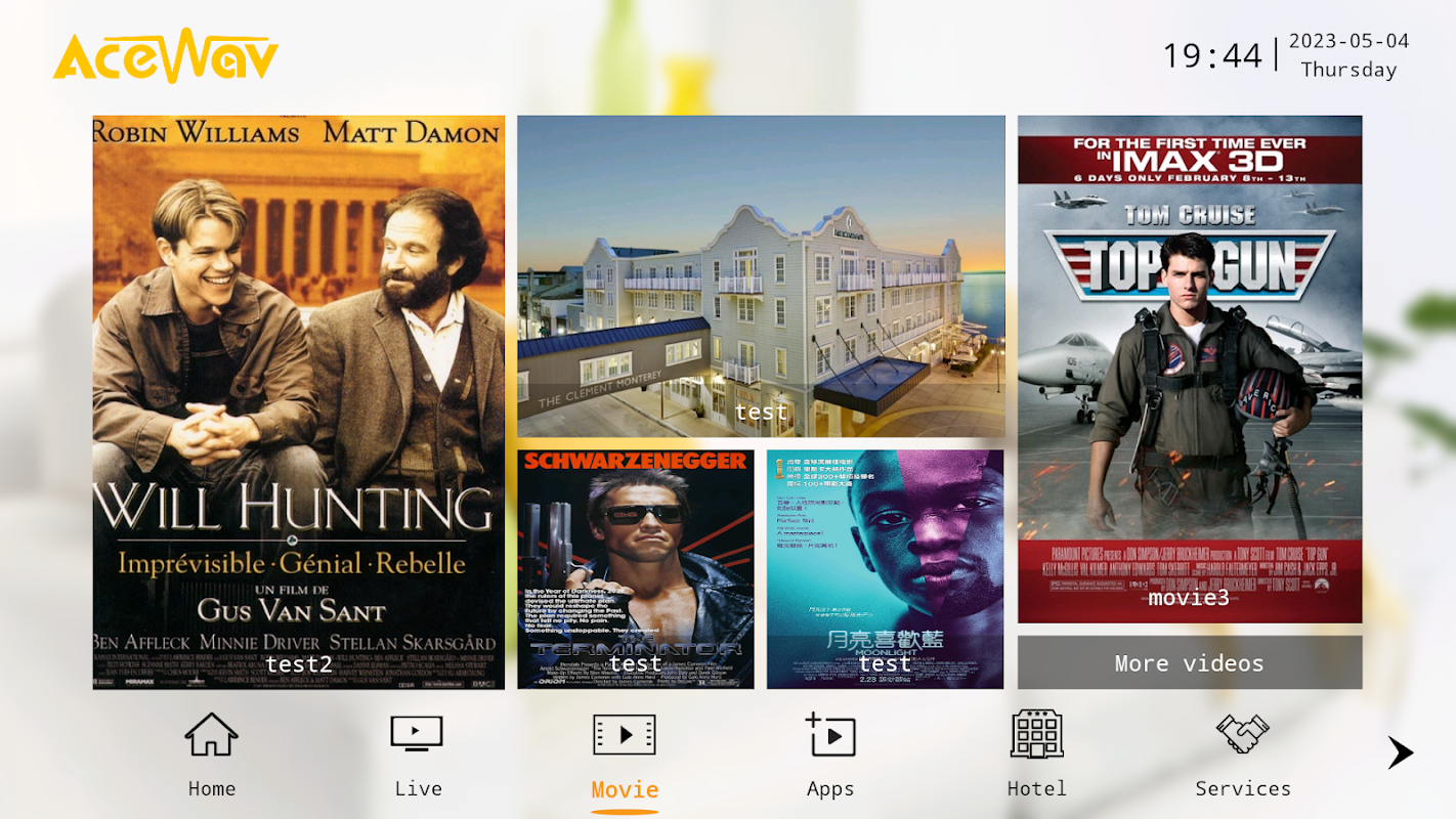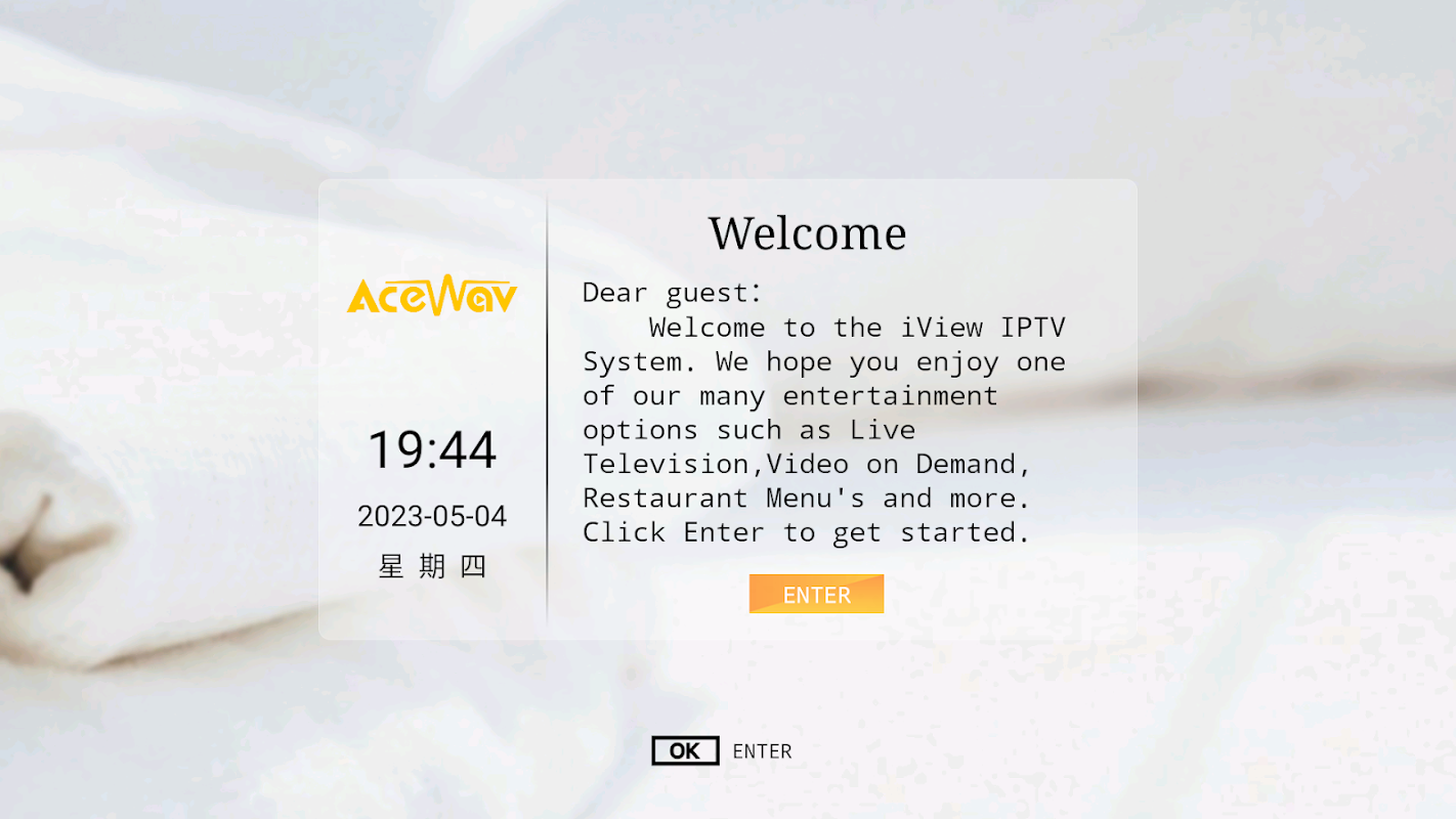 این یک نرمافزار کاربردی IPTV هتل است که از پخش زنده بیدرنگ، عملکردهای رابط سفارشیسازی پوستر، و همچنین از اطلاعات مشتریان ورود به هتل برای نمایش کلمات خوشآمد پشتیبانی میکند.