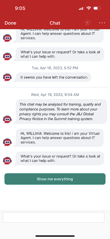 Iris به کارمندان و پیمانکاران Johnson & Johnson اجازه می دهد تا از هر دستگاه تلفن همراه پشتیبانی خدمات فناوری دریافت کنند. می توانید با یک نماینده چت کنید، شماره تلفن میز راهنمایی و ساعات پشتیبانی را بیابید، درخواست ارسال کنید، مشکلی را گزارش کنید و فعالیت اخیر خود را مشاهده کنید. جستجوی هوش مصنوعی به شما امکان می دهد دانش یا اقلام مورد نیاز خود را پیدا کنید. اعلانهای فشاری ممکن است برای ردیابی وضعیت درخواستها و تأییدیهها فعال شوند. برنامه Iris فروشگاه تکی شما برای پشتیبانی IT در دستگاه های تلفن همراه است.