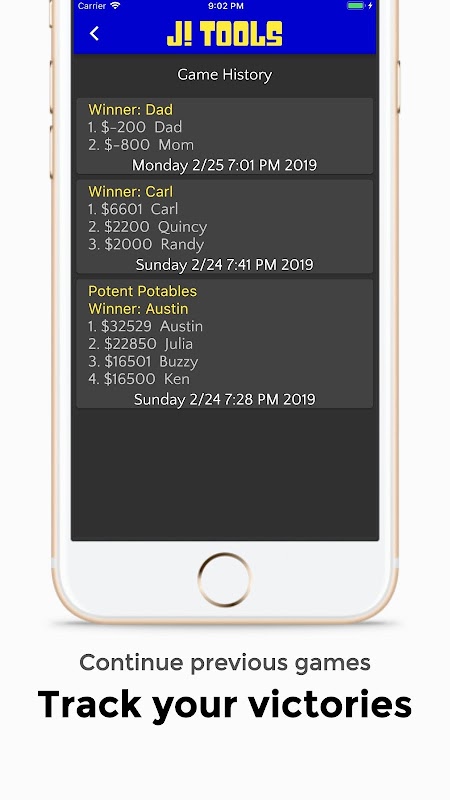 This app helps you quickly track player scores and game results regardless of whether you are playing along with the show or running your own Jeopardy! tournament. You can play any way you want: add, subtract, wager, or just tally; you choose what works for you!