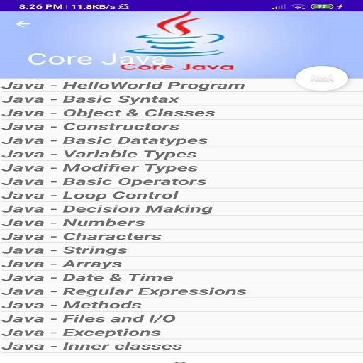 This App is for java programming Learner which consists portion such as core java, advanced java, and java Programs and Java interview Questons.