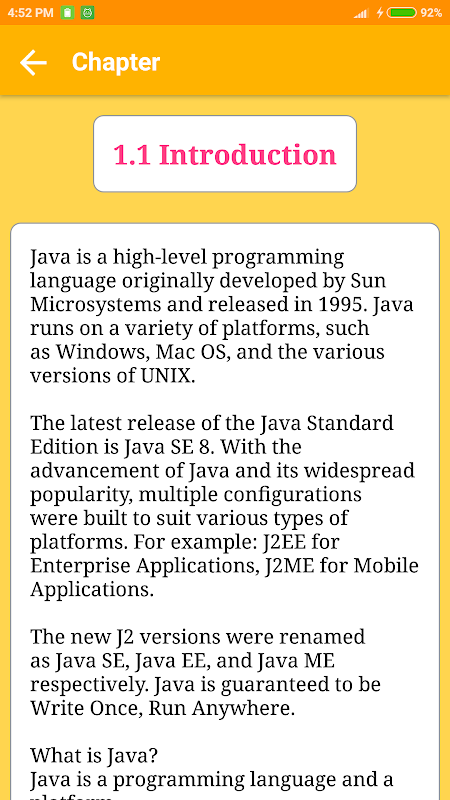 این برنامه دارای یک رابط کاربری ساده با توضیحات زیبا و ذهن آور است. با استفاده از برنامه جاوا آموزش و برنامه نویسی می توانید یادگیری کد را آسان و سرگرم کننده کنید.