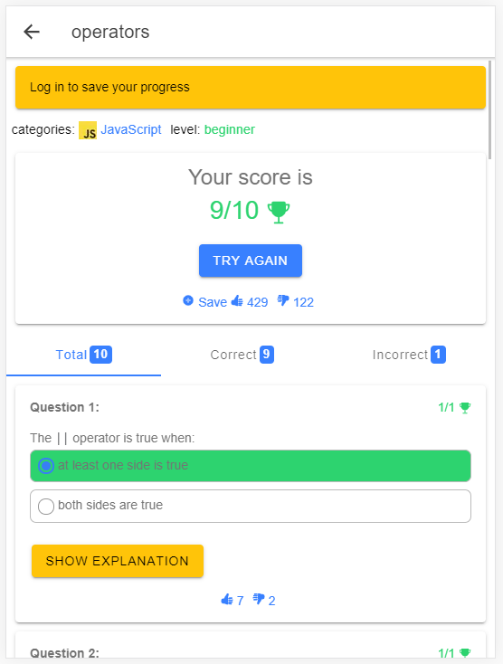 ⭐ پیشرفت از طریق آزمون ها و سوالات جاوا اسکریپت به سطوح مبتدی، متوسط و پیشرفته. مهارت های خود را با سرعت خود توسعه دهید.
