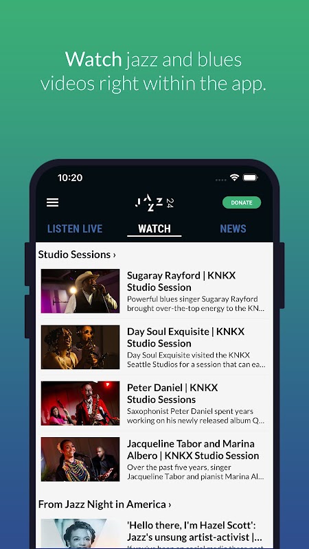 • تماشای اجراهای جاز — تماشا و گوش دادن به بهترین هنرمندان جاز امروزی که در استودیوهای KNKX سیاتل و در مکانهای معروف اجرا میکنند.