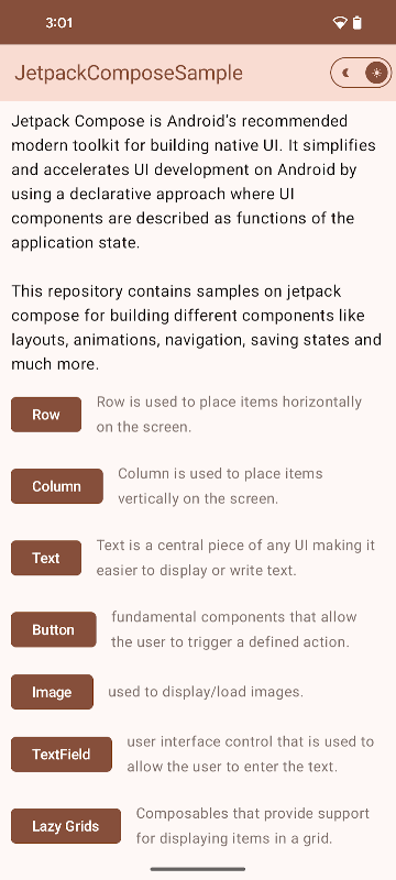 برنامه Jetpack Compose Sample یک منبع ضروری برای توسعه دهندگان Android است که میخواهند جعبه ابزار مدرن و گویا UI گوگل را یاد بگیرند و بر آن مسلط شوند. این برنامه که با وضوح و تمرکز بر پیاده سازی عملی ساخته شده است، ویترینی دقیق از ویژگی های Jetpack Compose را ارائه می دهد و به توسعه دهندگان کمک می کند تا اصول و مزایای برنامه نویسی UI اظهاری را درک کنند و در عین حال قدرت کامل Compose را تجربه کنند.
