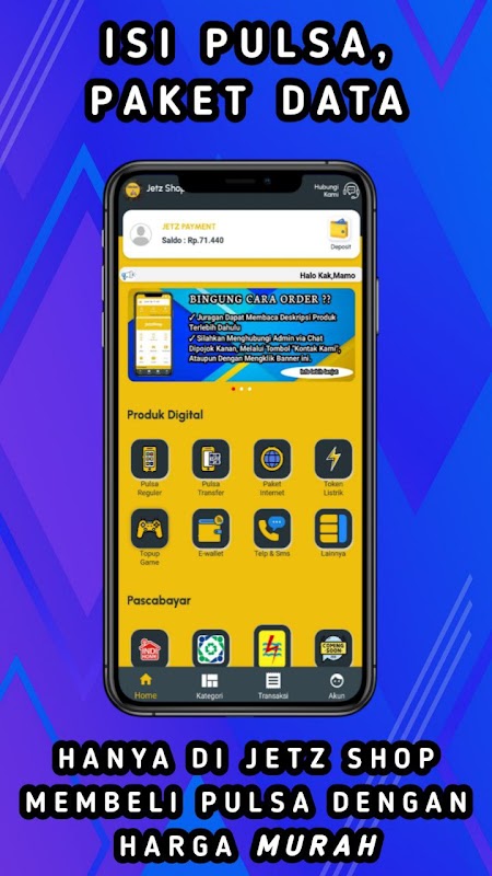 Sekarang dengan JETZ SHOP, kamu tidak perlu pusing lagi membayar tagihan prabayar maupun pasca bayarmu. Cukup dengan JETZ SHOP, kamu sudah bisa beli pulsa, paket internet, token listrik, uang digital, telkom, dan masih banyak lagi.