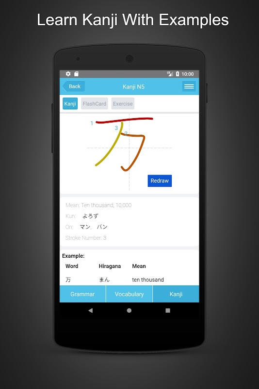 در بخش کانجی شما می توانید در مورد نوشتن، -kun و -ان تلفظ از طریق نمونه یاد بگیرند. به خصوص با کانجی مرتبا آن را آسان تر برای شما برای یادگیری و به یاد داشته باشید، پس از هر درس آزمونها تمرینات برای تمرین داشته باشد.