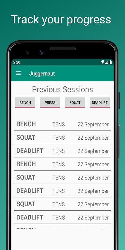 این برنامه هر جلسه از روش Juggernaut را برای شما بر اساس سطح قدرت فعلی خود برنامه ریزی می کند. می توانید تمام جلسات قبلی را مرور کرده و نمودار پیشرفت خود را با گذشت زمان تحسین کنید. پیشرفت وزنه هایی که استفاده می کنید براساس عملکرد شما بطور خودکار محاسبه می شود.
