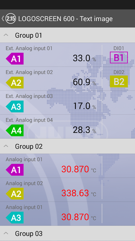 جت Jumo رایگان برنامه اجازه می دهد تا دستگاه های هوشمند و قرص برای برقراری ارتباط با ضبط بدون کاغذ JUMO LOGOSCREEN 600. این برنامه می تواند برای دستگاه های در شبکه شرکت اسکن و نمایش دستگاه های کشف شده در یک لیست آسان به خواندن. کاربران می توانند دستگاه هم از این لیست انتخاب کنید و یا انجام این کار به صورت دستی با وارد کردن آدرس IP طراحی / DNS. اگر یک دستگاه JUMO است از طریق برنامه انتخاب شود، دستگاه برنامه که داده های آن را تامین می کنند می گوید. این داده ها می تواند، برای مثال، شامل مقادیر جریان اندازه گیری، حوادث، یا آلارم.