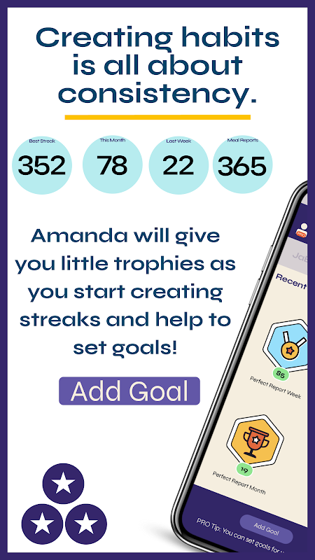 آماندا، همراه هوش مصنوعی شما، با پیام های تشویق، تایید و حقایق سرگرم کننده پاسخ خواهد داد. او همچنین این اطلاعات را در دفتر خاطرات شما ثبت میکند و نمودارهای فوقالعاده جالبی میسازد تا شما دادههای عملی داشته باشید و بتوانید پیشرفت خود را در طول زمان پیگیری کنید.
