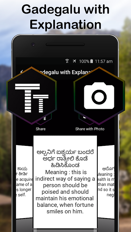 In Kannada Gadegalu with Explanation ( ಗಾದೆಗಳು ) App You Can Download New Gadegalu with meaning every day....